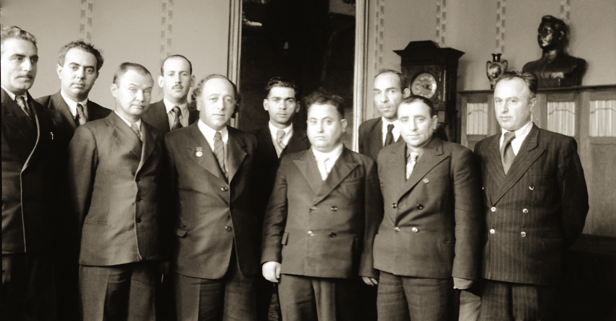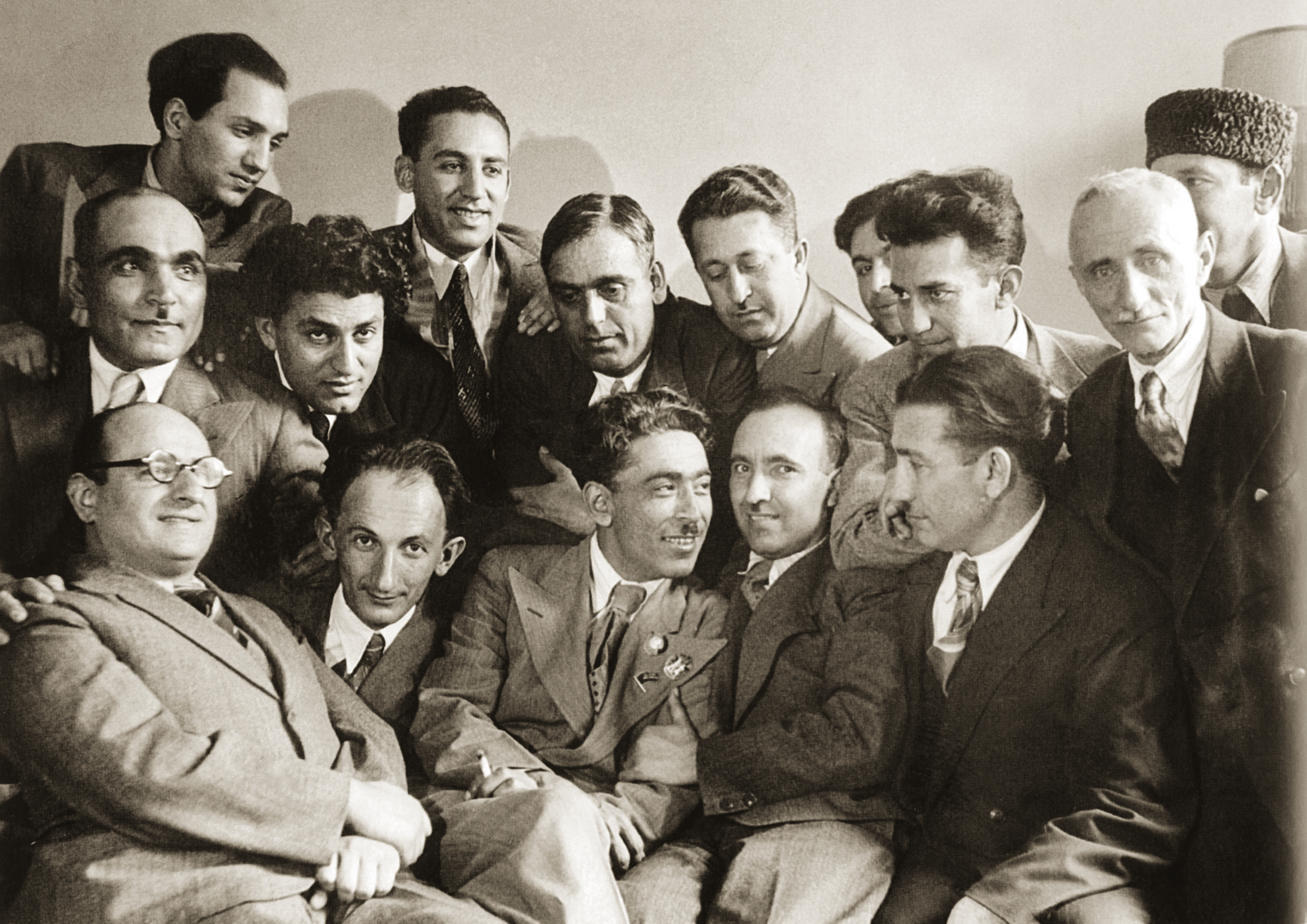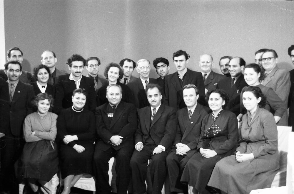 Ön cərgədə soldan: Mikayıl Rəfili, Sabit Rəhman, Səməd Vurğun, Mir Cəlal, Süleyman Rəhimov. Arxa cərgədə sağdan: Əvəz Sadıq, Cəfər Cəfərov, Hidayət Əfəndiyev, Əli Vəliyev, Məmməd Rahim, Mehdi Hüseyn, Abdulla Şaiq və başqaları (1945) |