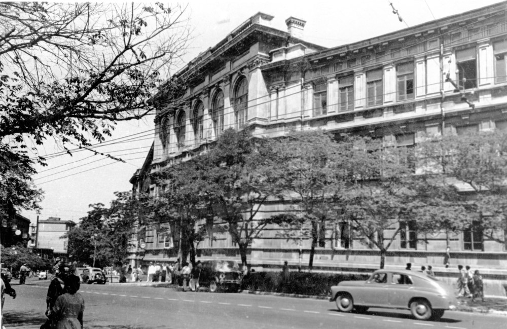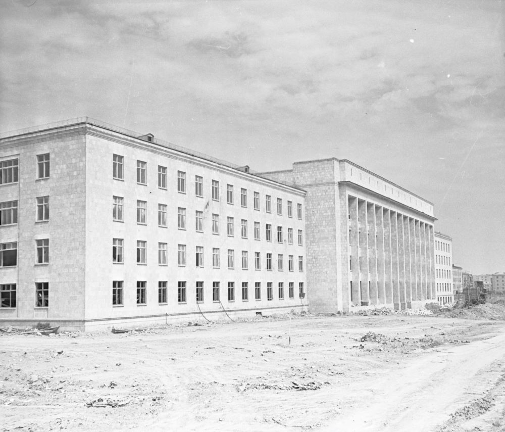 | Universitet binasının ümumi görünüşü (1953) | Mayakovski adına Moskva teatrının aktyoru, SSRİ xalq artisti Lev Sverdlin Universitetin qonağıdır (ortada akademik Yusif Məmmədəliyev) (1955) | Universitetin əsas binasının tikintisi (1963) |