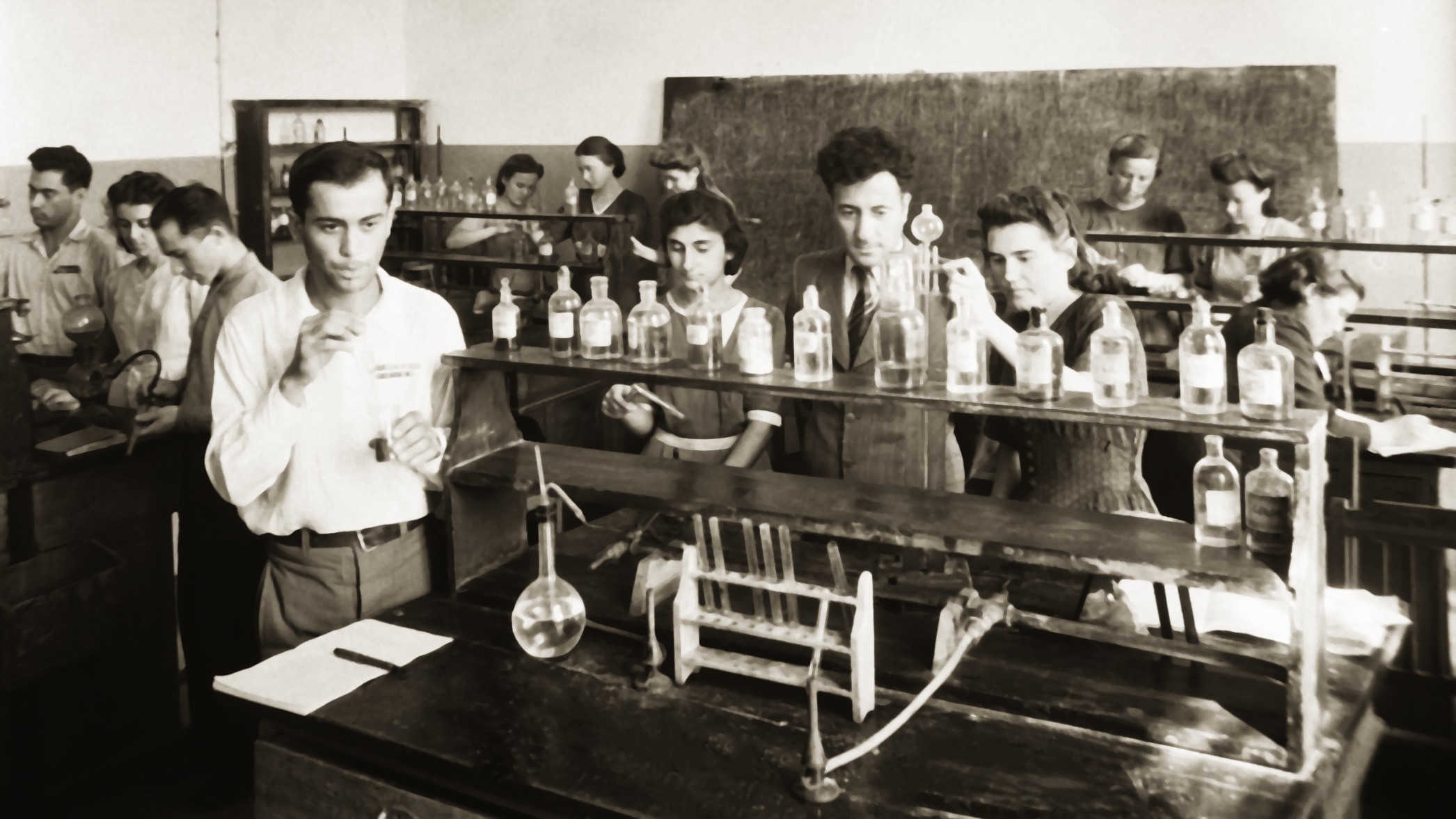 | Universitetin professor-müəllim heyəti müzakirələr zamanı (1940) | Dosent Cümşüd Zülfüqarlı Qeyri-üzvi kimya laboratoriyasında (1940) |