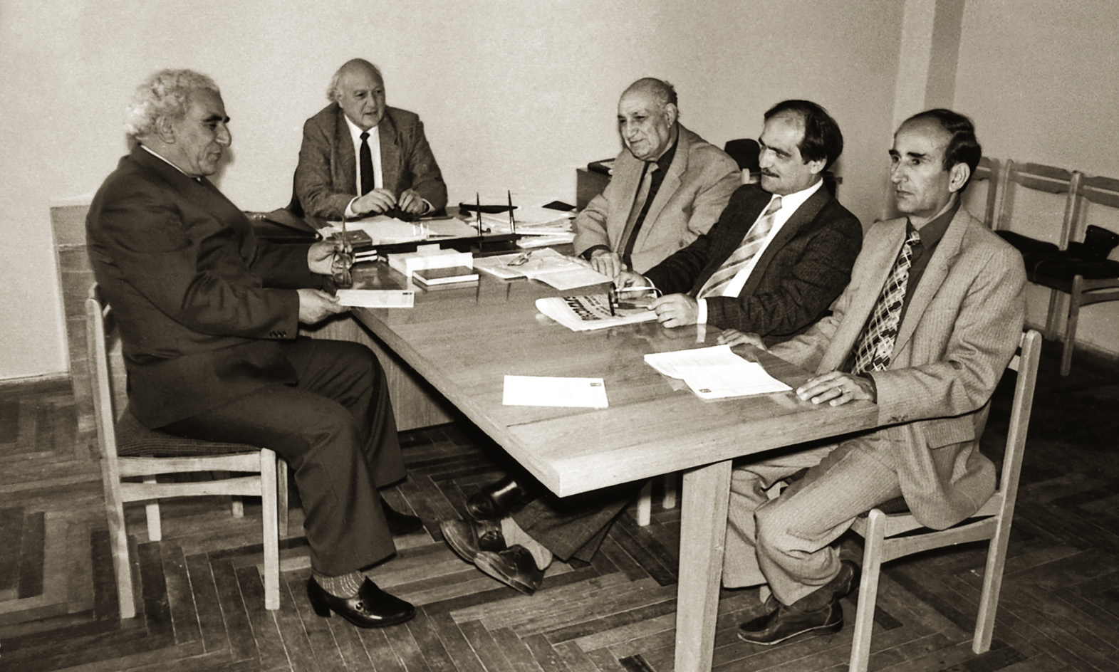 Jurnalistikanın nəzəriyyəsi və təcrübəsi kafedrasının əməkdaşları: Famil Mehdi, Nəsir İmanquliyev, Akif Rüstəmov, Mahmud Mahmudov və Adıgözəl Qəmbərov (1987)