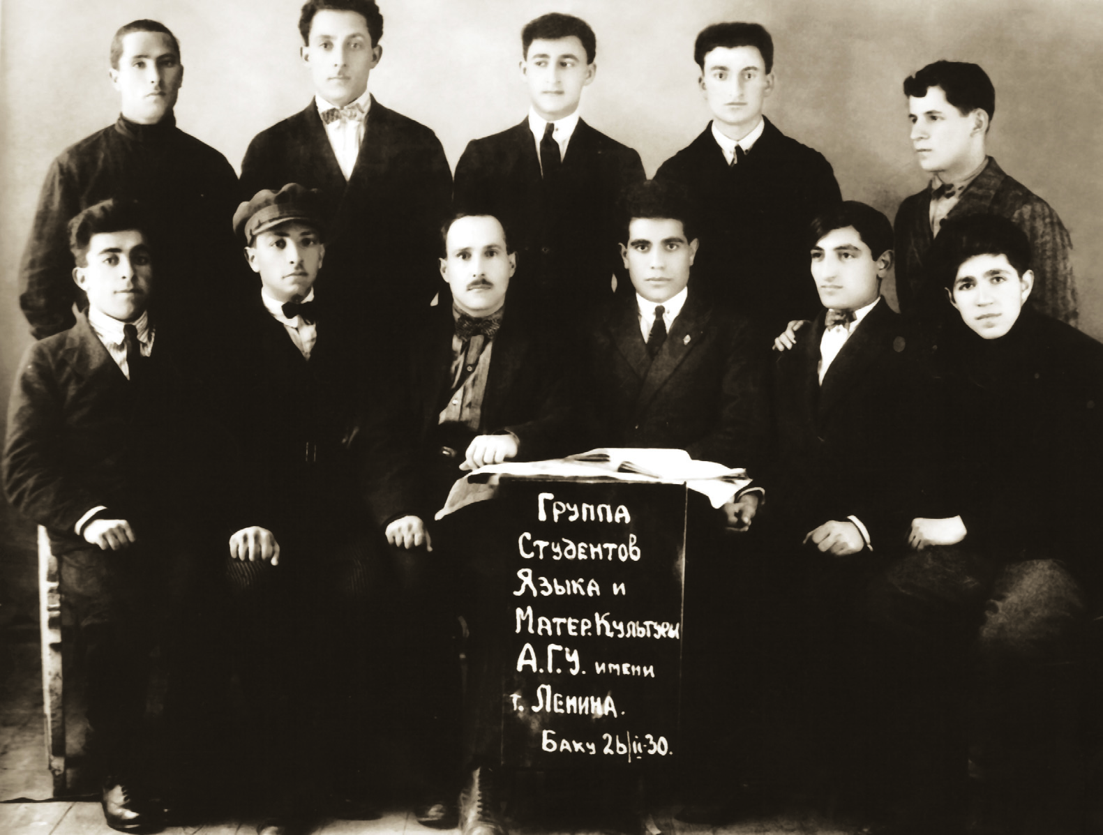 Universitetin Filologiya fakültəsinin bir qrup tələbəsi. Ön cərgədə sağdan 2-ci: Cəfər Xəndan Hacıyev (1930) |