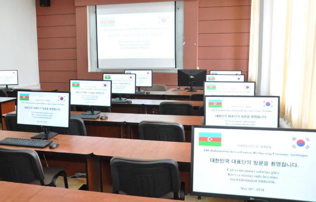 Azərbaycan-Koreya İnformasiya Təminatı Mərkəzi - Azərbaycan-Koreya İnformasiya Təminatı Mərkəzi 2008-ci ilin 17 dekabr tarixində Koreya dövlətinin birbaşa dəstəyi ilə xarici və daxili rəqəmsal sistemləri hərtərəfli təmin etmək məqsədilə yaranan KADO-nun (Korean Agency for Digital Opportunities and Promotion) yardımı ilə açılıb. 2012-ci ilin may ayında Koreya Milli İnformasiya Cəmiyyətinin icraçı direktoru Myungha Hongun Bakı Dövlət Universitetinə səfəri zamanı Mərkəzin yenilənməsinə dair müqavilə imzalanıb. Yenilənmə işlərinə mərkəzin kompyuter sisteminin əvəzlənməsi, video-konfrans və virtual universitetin yaradılması daxil edilib. Mərkəzin əsas məqsədi tələbələrin müasir rəqəmsal texnologiya və avadanlıqlar ilə tanış olması, son informasiya texnologiyalarına yiyələnmək, onların qloballaşan dünyanın inteqrasiya proseslərində daha fəal iştirakının təmin olunmasıdır. Azərbaycan-Koreya İnformasiya Təminatı Mərkəzində tələbələrin daha geniş kompüter biliklərinə malik olmaları, eyni zamanda proqramlaşdırma dillərinə mükəmməl yiyələnmələri üçün bütün şərait vardır. İnternet Lounge room isə öz növbəsində tələbələrin və tədqiqatla məşğul olan şəxslərin internet vasitəsilə lazımi məlumatları əldə etmələri məqsədinə xidmət edir. |